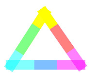 Aus grünem, rotem und blauem Licht zusammen entsteht weißes Licht. Je zwei dieser Lichtfarben ergeben Cyan, Gelb oder Magenta. Grün plus Rot ist in diesem Fall also Gelb. Schwarz ergibt sich als Fehlen jeglichen Lichts.
